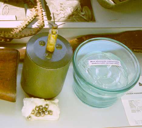 In 1943, the Germans introduced another non-metallic mine, the Glassmine 43. This mine had a body made entirely of glass in order to reduce its delectability. Although, inevitably, part of the firing mechanism had to be metal, the mine was still difficult to detect. It is not known if these were used in Italy. See the color photo, below.